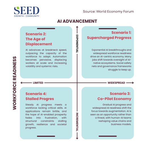 The four AI impact scenarios emphasize a key point: the promise of AI can only be realized if people have the right skills.